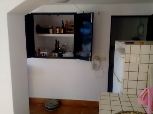 Skab ved udekøkkenet med tallerkener, glas og bestik m.v